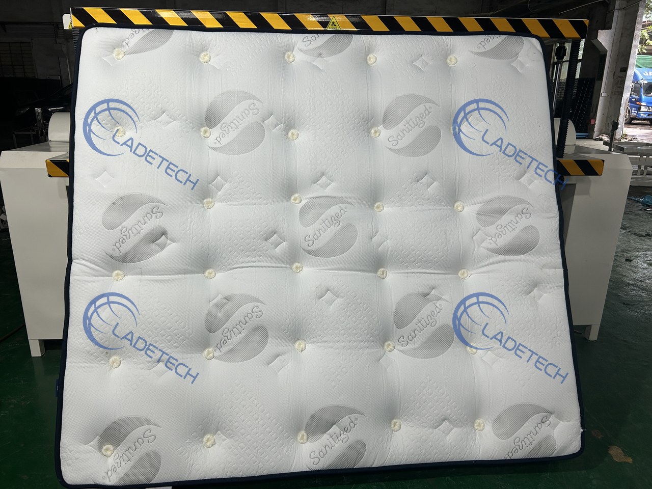 This machine is specialized to support and compress mattress, assisting mattress buttoner to put on woolen or felt button so as to make the mattress more beautiful and druable.